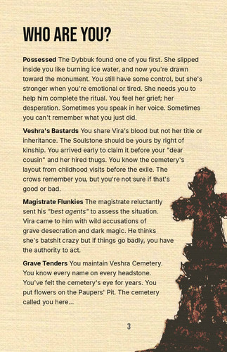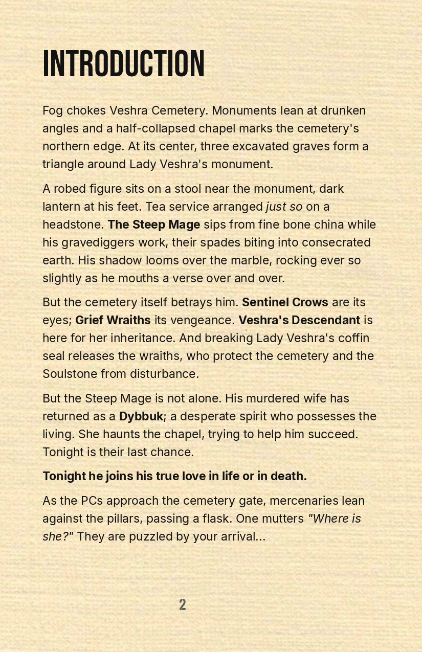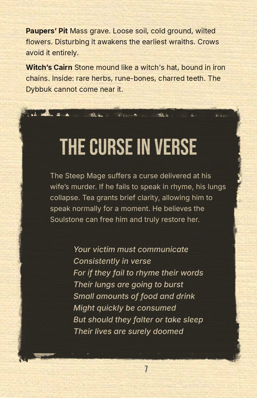 A mage sits in a cemetery, sipping tea while his diggers excavate Lady Veshra's grave. He must speak only in rhyme lest his lungs collapse. His murdered wife possesses the living to assist his ritual. The cemetery fights back with sentinel crows and grief wraiths. Veshra's descendant wants the Soulstone inside the coffin... her last asset.